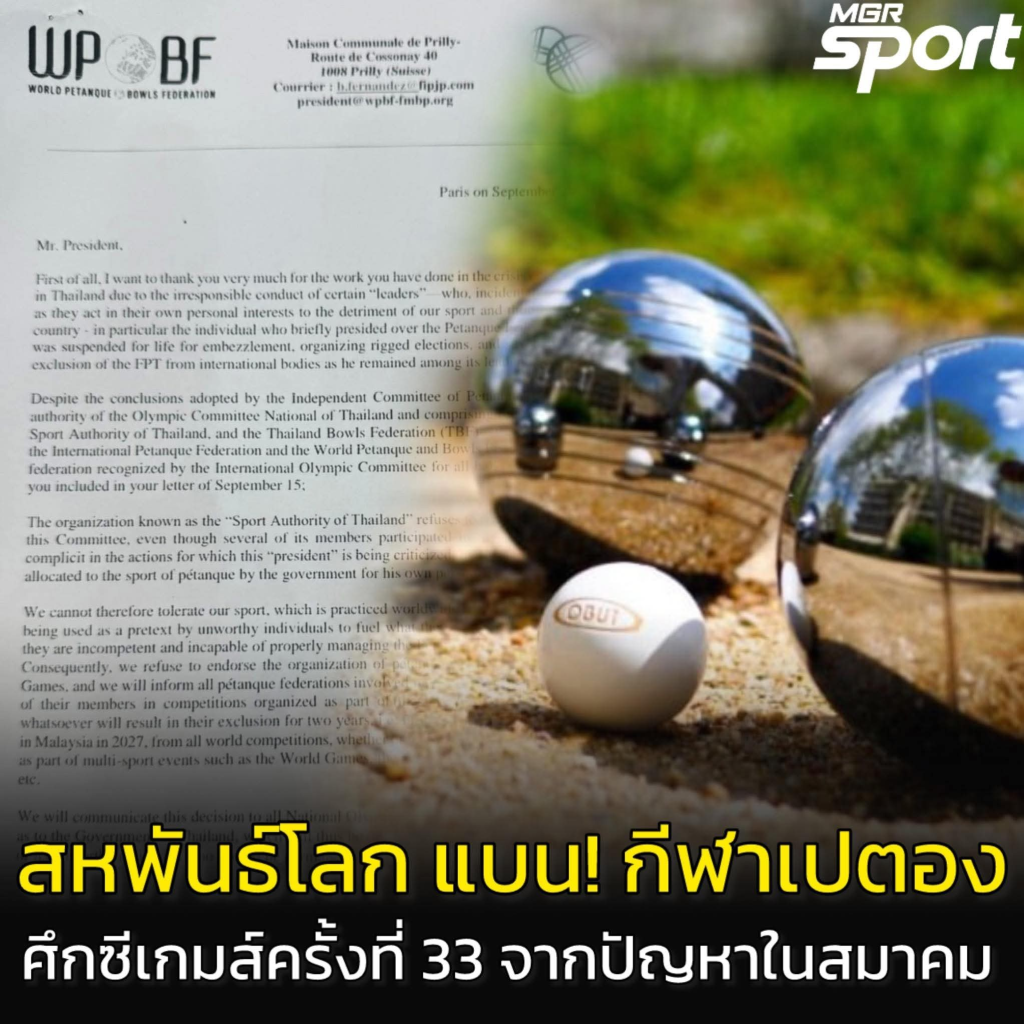 សហព័ន្ធកីឡាប៊ូល និងប៉េតង់ ពិភពលោក សម្រេចចិត្តមិនបញ្ជូនប្រភេទកីឡានេះទៅស៊ីហ្គេមលើកទី៣៣ ដោយសារថៃមិនគោរពលក្ខខណ្ឌ