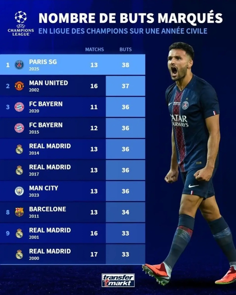 វេបសាយ Transfermarkt បានចងក្រងស្ថិតិនៃក្លិបដែលបានស៊ុតបញ្ចូលទីច្រើនជាងគេក្នុងឆ្នាំប្រតិទិននៅ Champions League ហើយ PSG ជាក្រុមដែលឈរកំពូលតារាង។